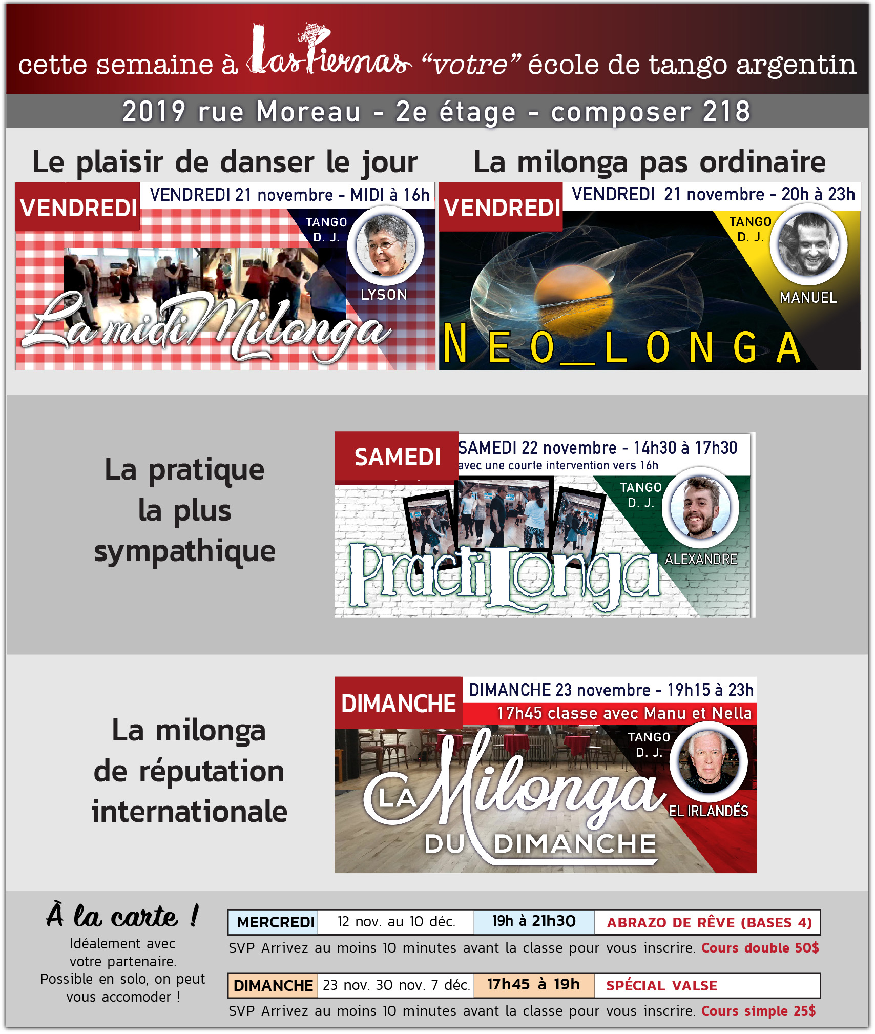 - Milonga du DIMANCHE de 19h15 à 23h. Notre traditionnelle milonga vous permet de terminer la fin de semaine en beauté avec des DJs de première classe d'ici et d'ailleurs, sur le meilleur plancher en ville et sous un accueil authentique et chaleureux.