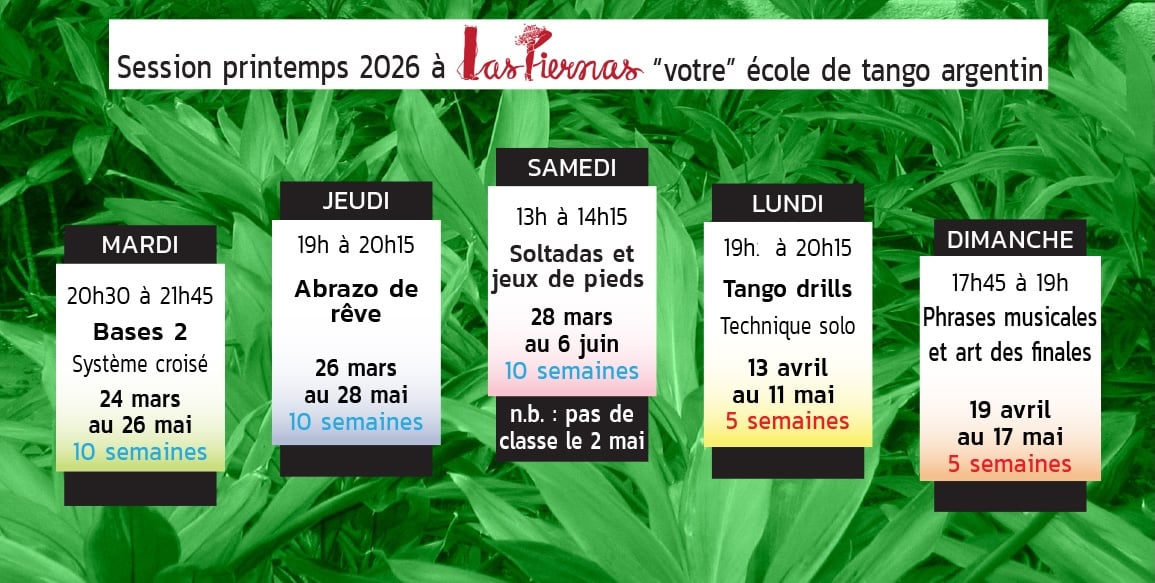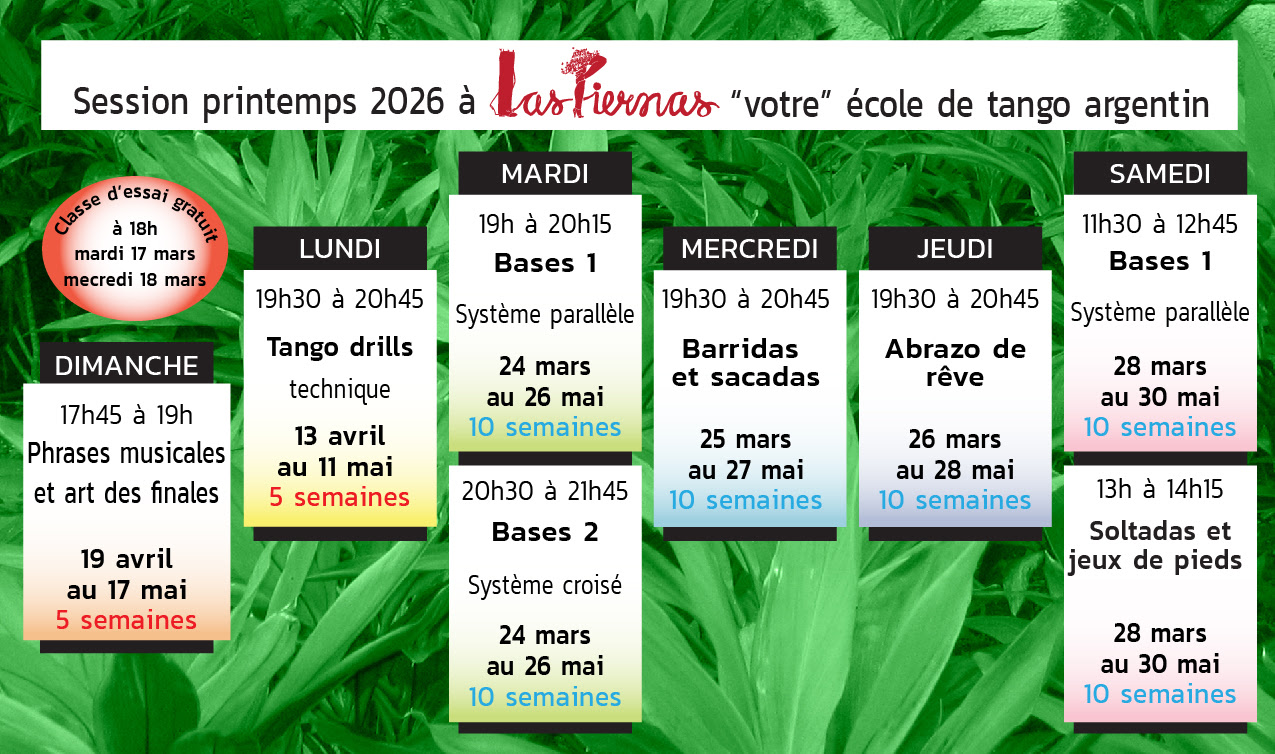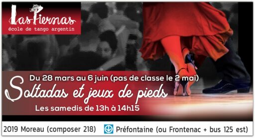 Chez Las Piernas on offre régulièrement des COURS D’ESSAI GRATUITS. Vous pouvez aussi essayer le premier cours gratuitement seulement pour le niveau Bases I. Si vous décidez de vous inscrire suite au premier cours du niveau Bases I, le paiement devra se faire pour la session complète. Ce qui veut dire que le cours gratuit suivi ne sera pas crédité du montant de la session. Pour les autres cours, vous pouvez assister au premier cours en payant celui-ci à la carte (25$). Si vous décidez de vous inscrire à la session, ce montant sera crédité du montant de la session.