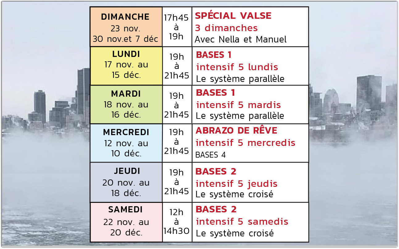 — BASES 4 : ABRAZO DE RÊVE : Danser confortablement et avec élégance en étreinte ouverte ou rapprochée (On suggère de faire cette session avec un.e partenaire de votre choix). (INTENSIF 5 semaines)
