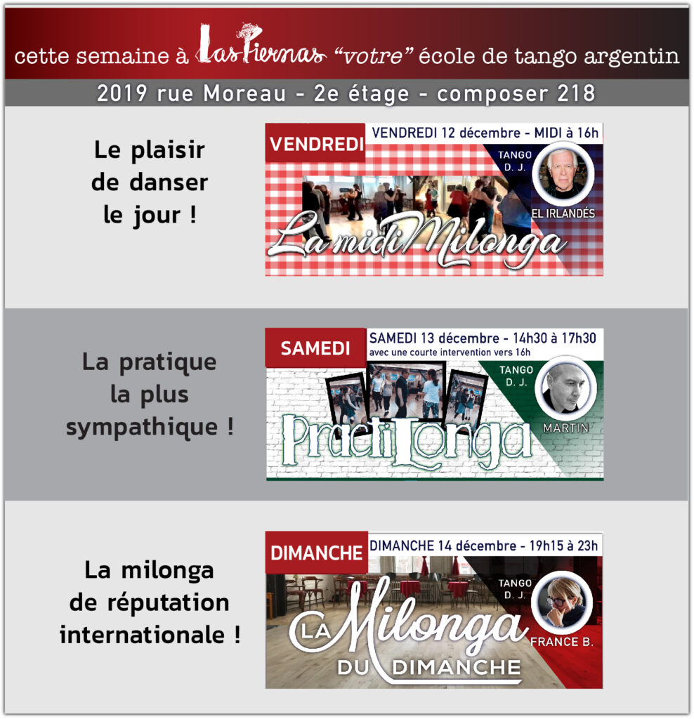 - La midiMilonga : VENDREDI de midi à 16h. Notre traditionnelle milonga de jour se déroule dans la bonne humeur et la convivialité. Venez danser pour bien commencer la fin de semaine : une bonne dose de bonheur !