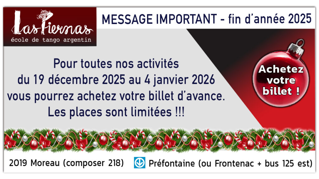 - Les Milongas 15$ (12$ membres de Las Piernas)